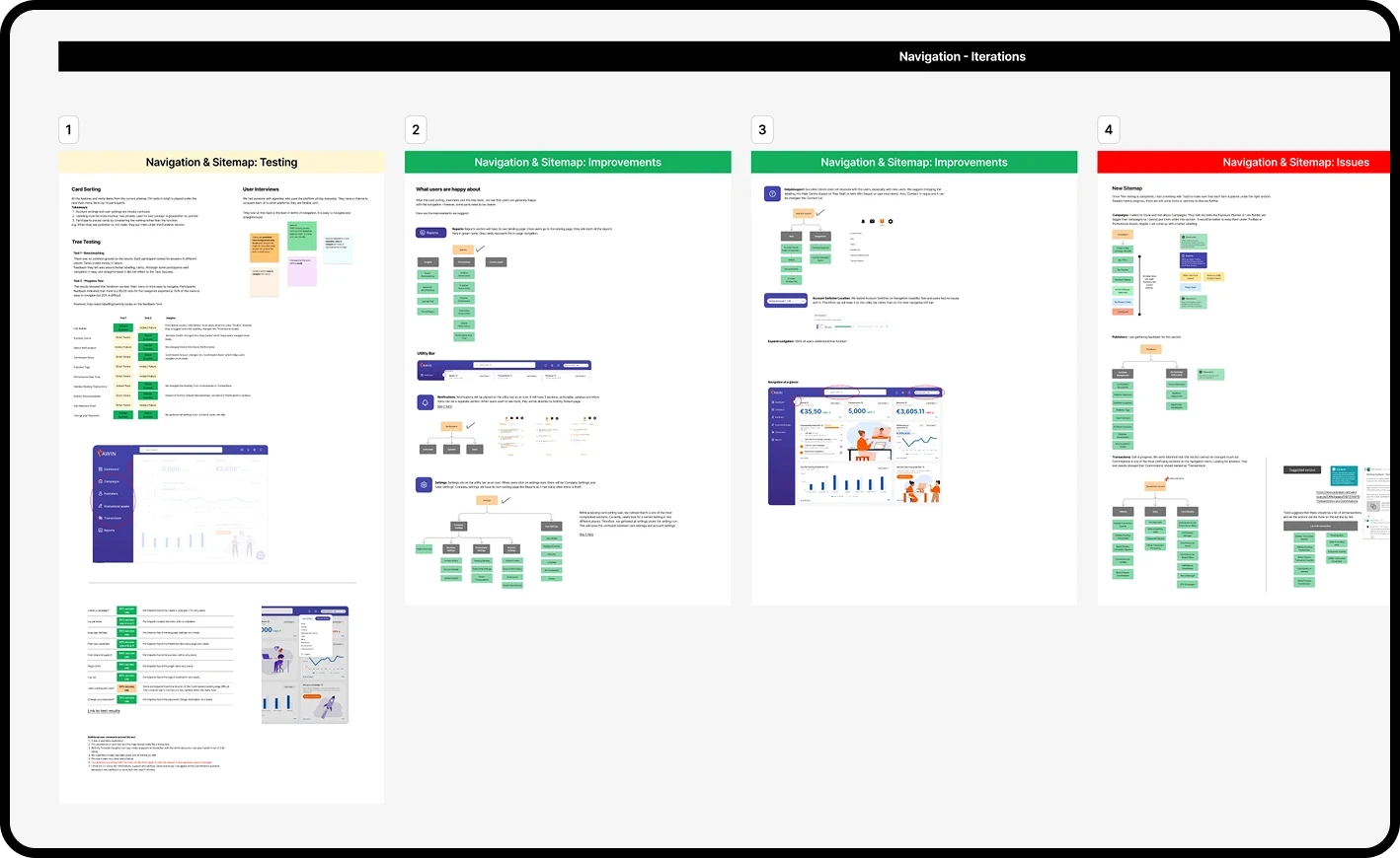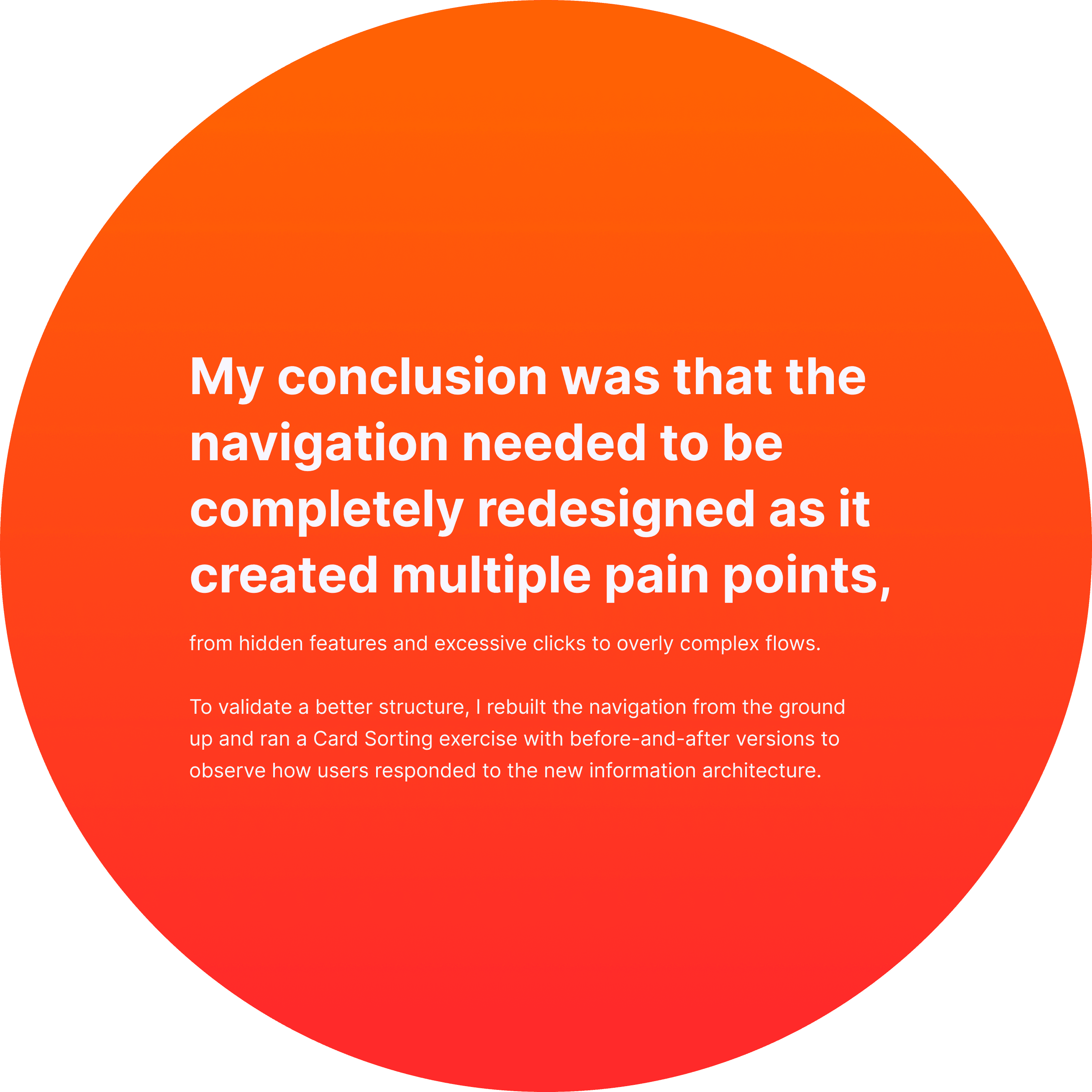 After redefining the navigation structure from scratch, I ran an online workshop with 14 users using Card Sorting, Tree Testing, and User Interviews to validate the ‘before’ and ‘after’ versions.