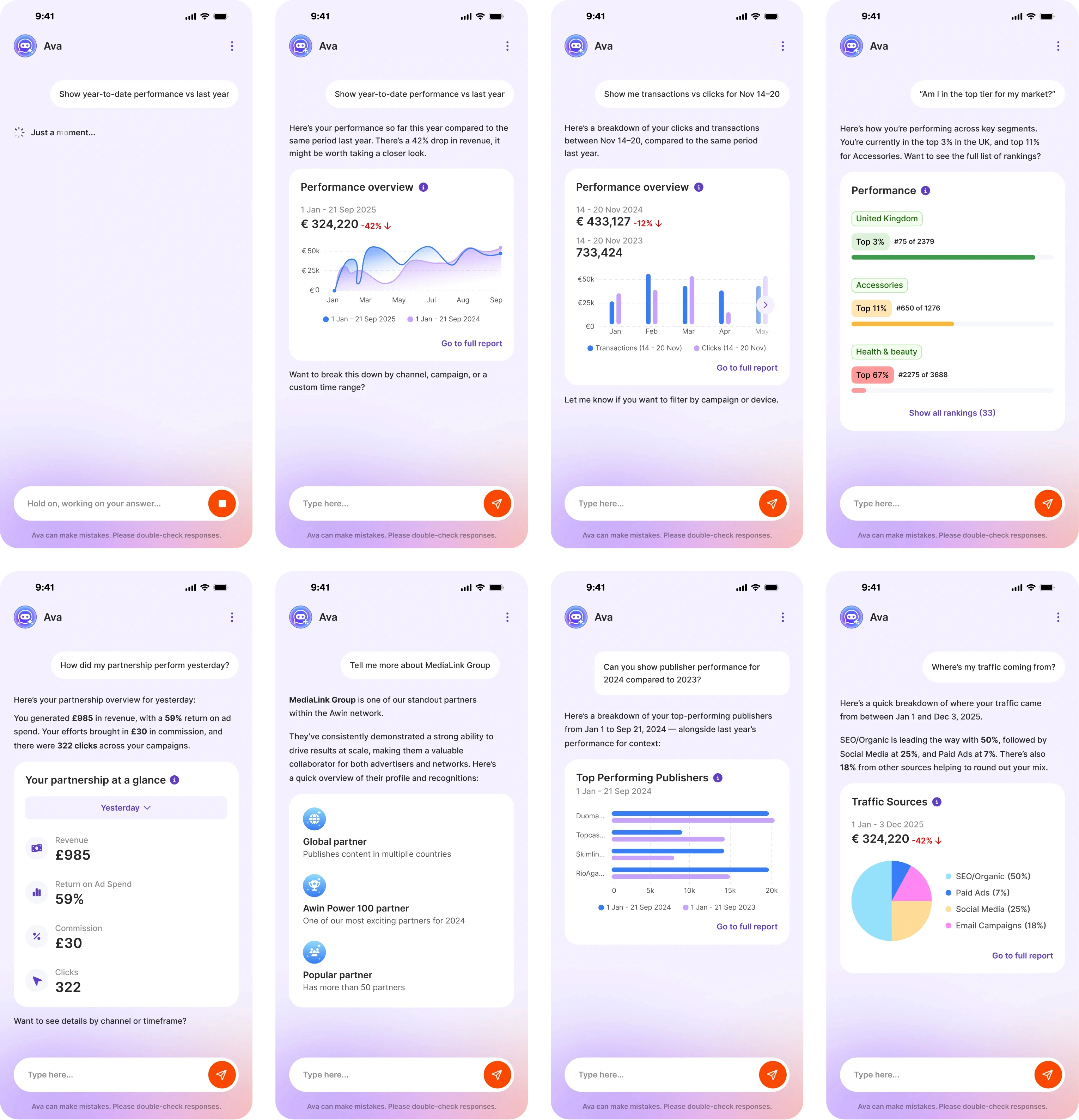 The Awin product ecosystem was built by multiple independent teams, each delivering features with different visual styles, patterns, and interaction models.