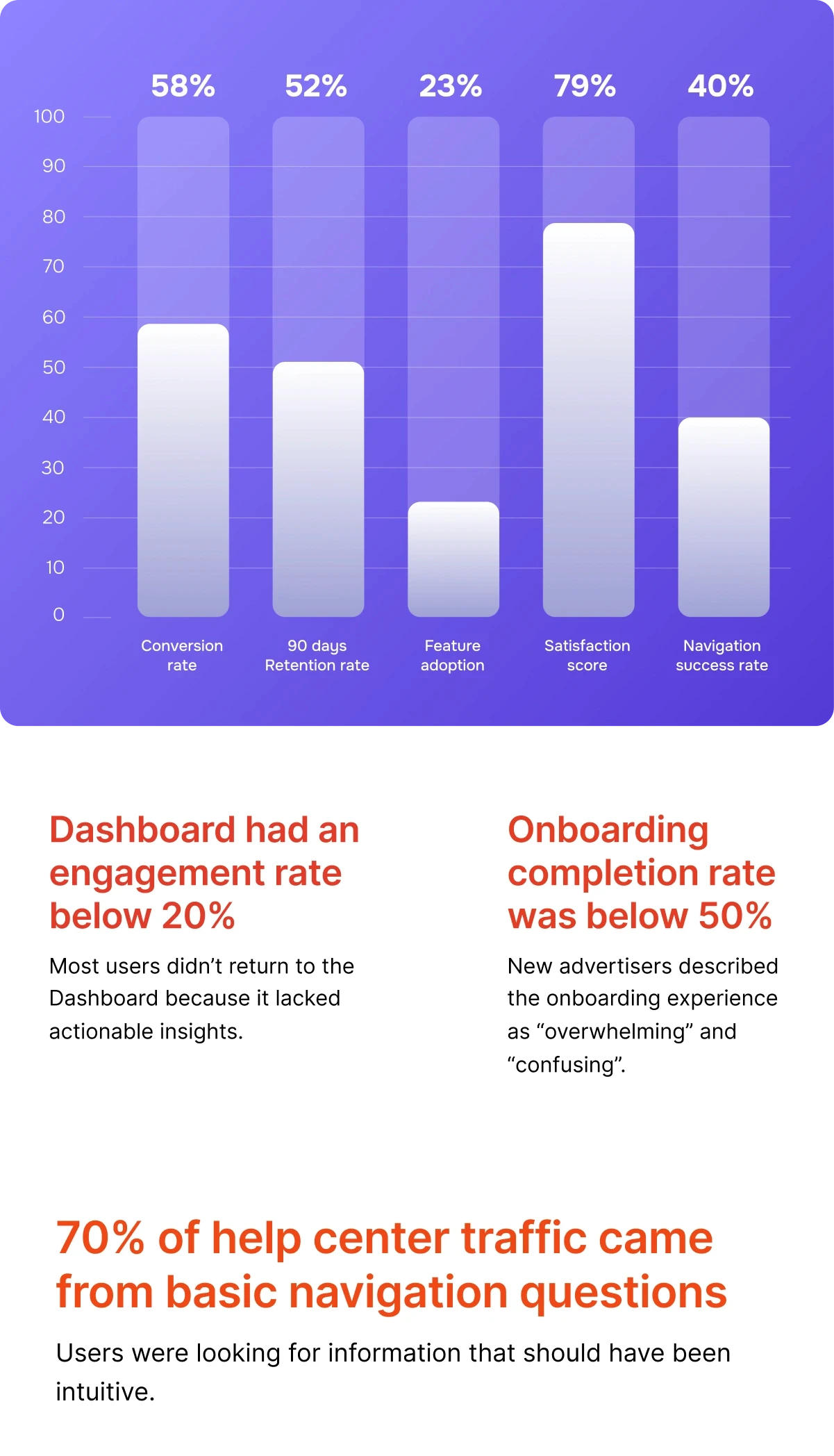 Low engagement on key pages. Users were not spending time where they were supposed to