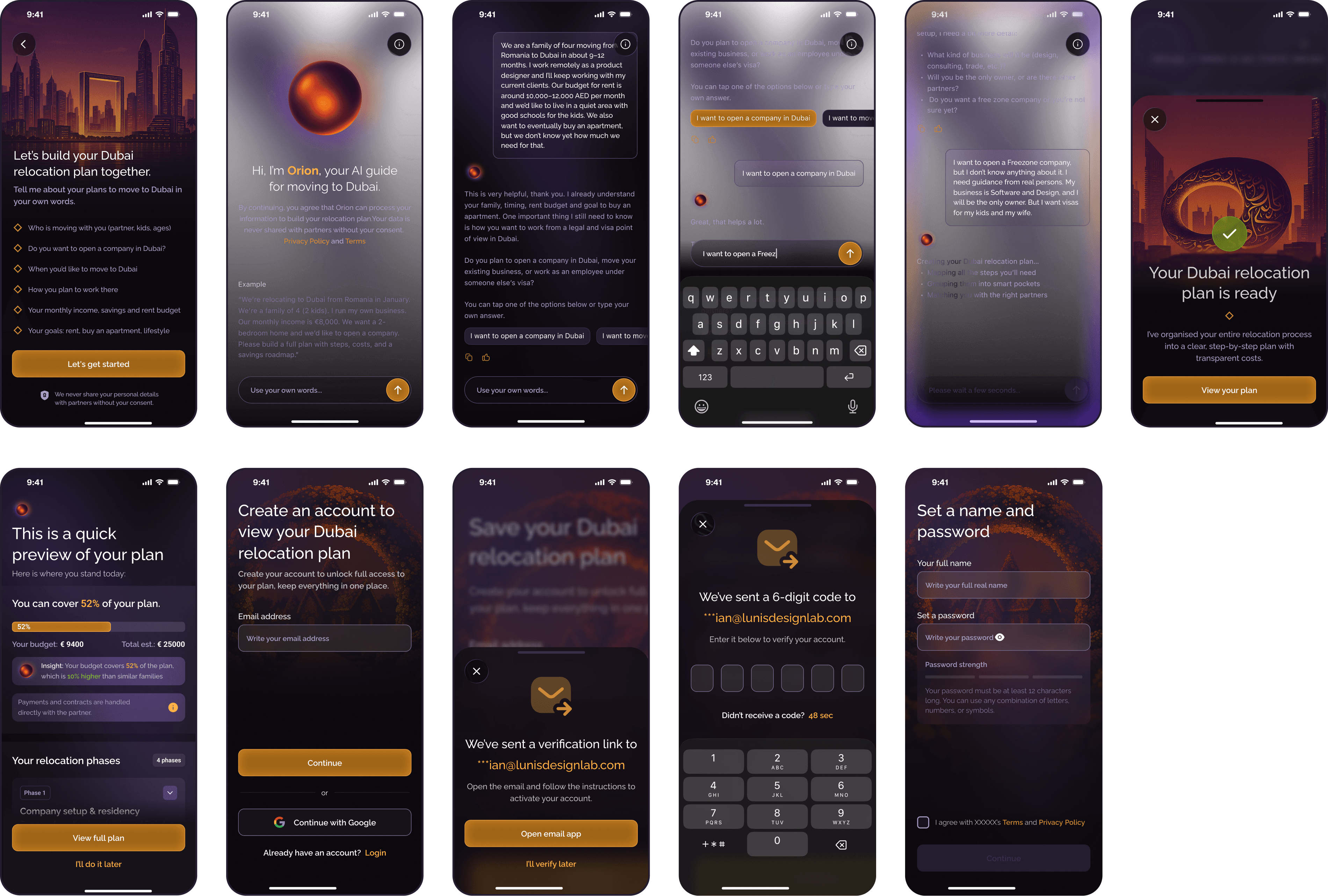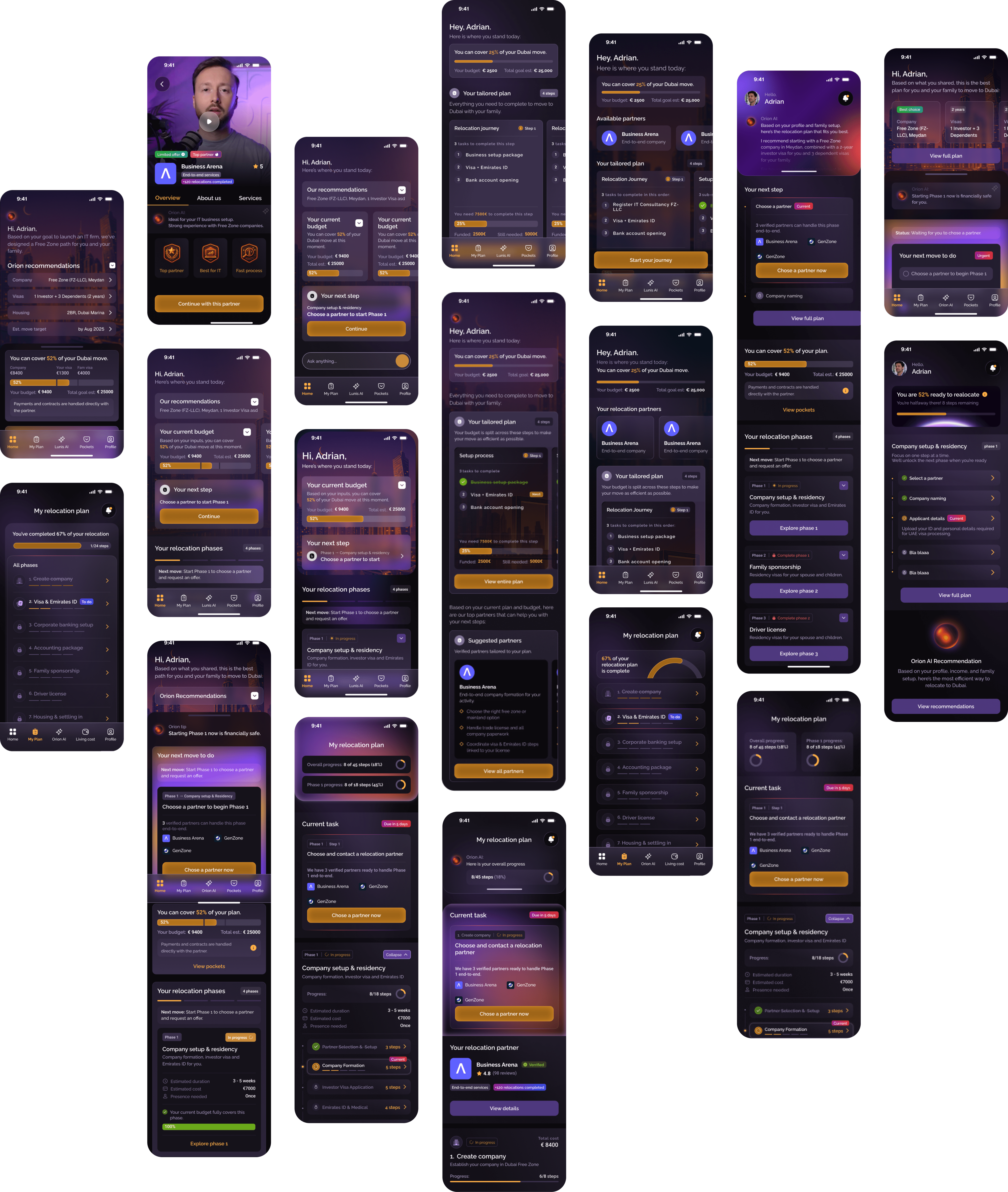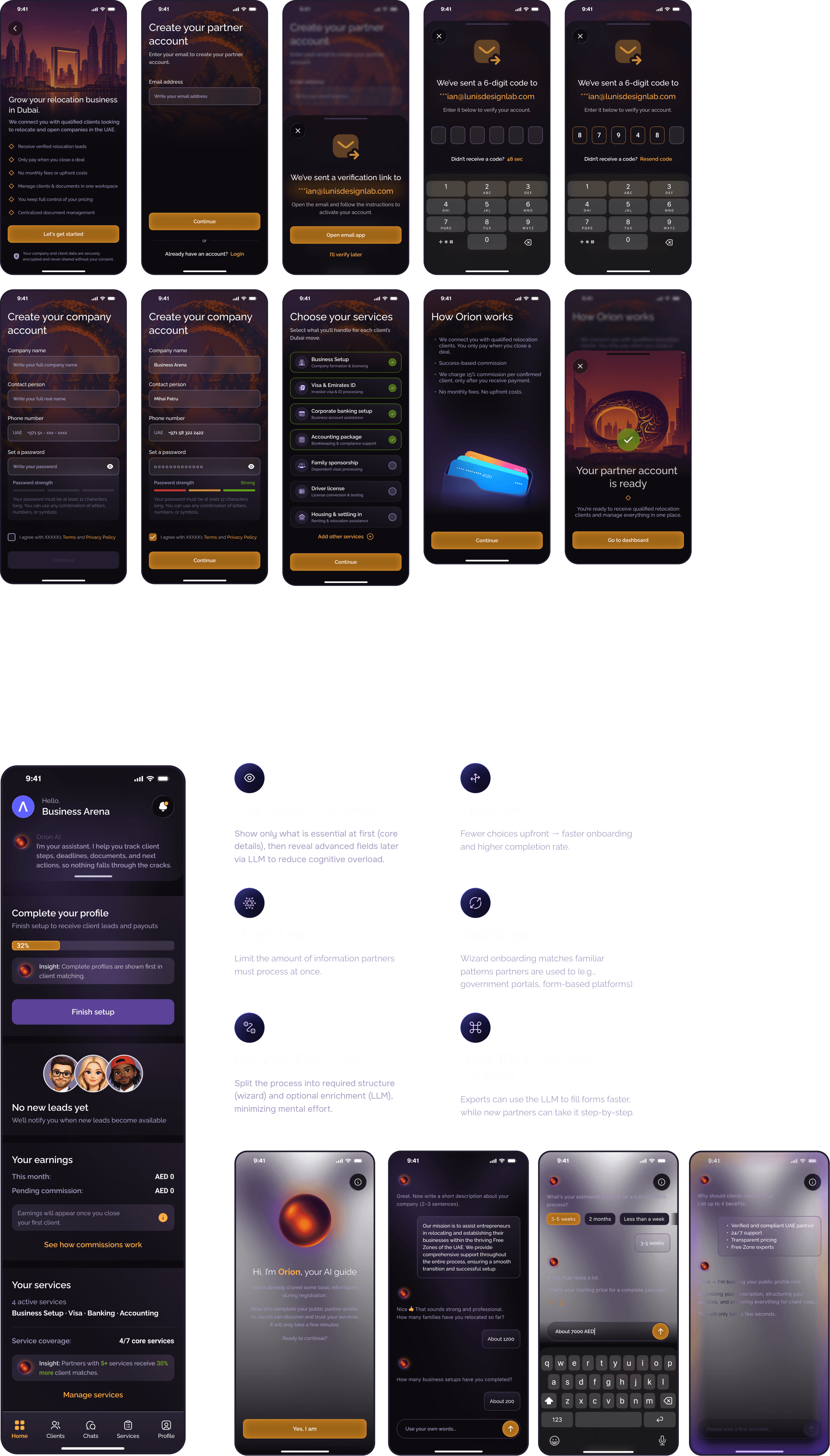 As the Lead Product Designer, I owned the complete design direction of the Orion platform, from early UX exploration to final UI execution. I defined the vision, the architecture, and the end-to-end user experience for both residents relocating to Dubai and partners managing clients.