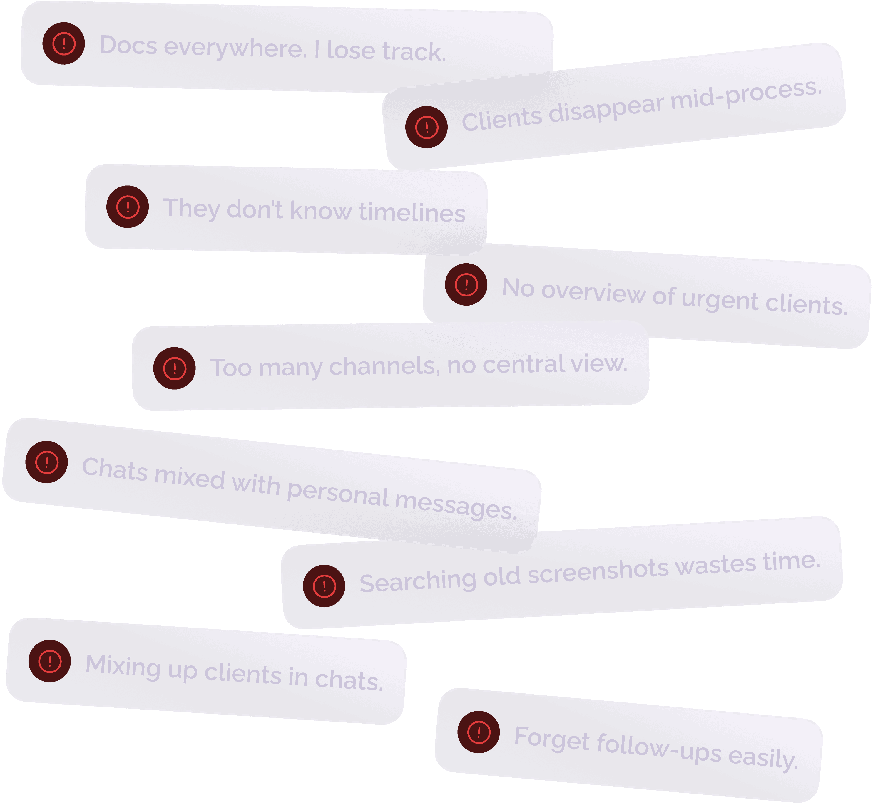 Every file is tied to the correct client and step, with no risk of losing documents in chats.