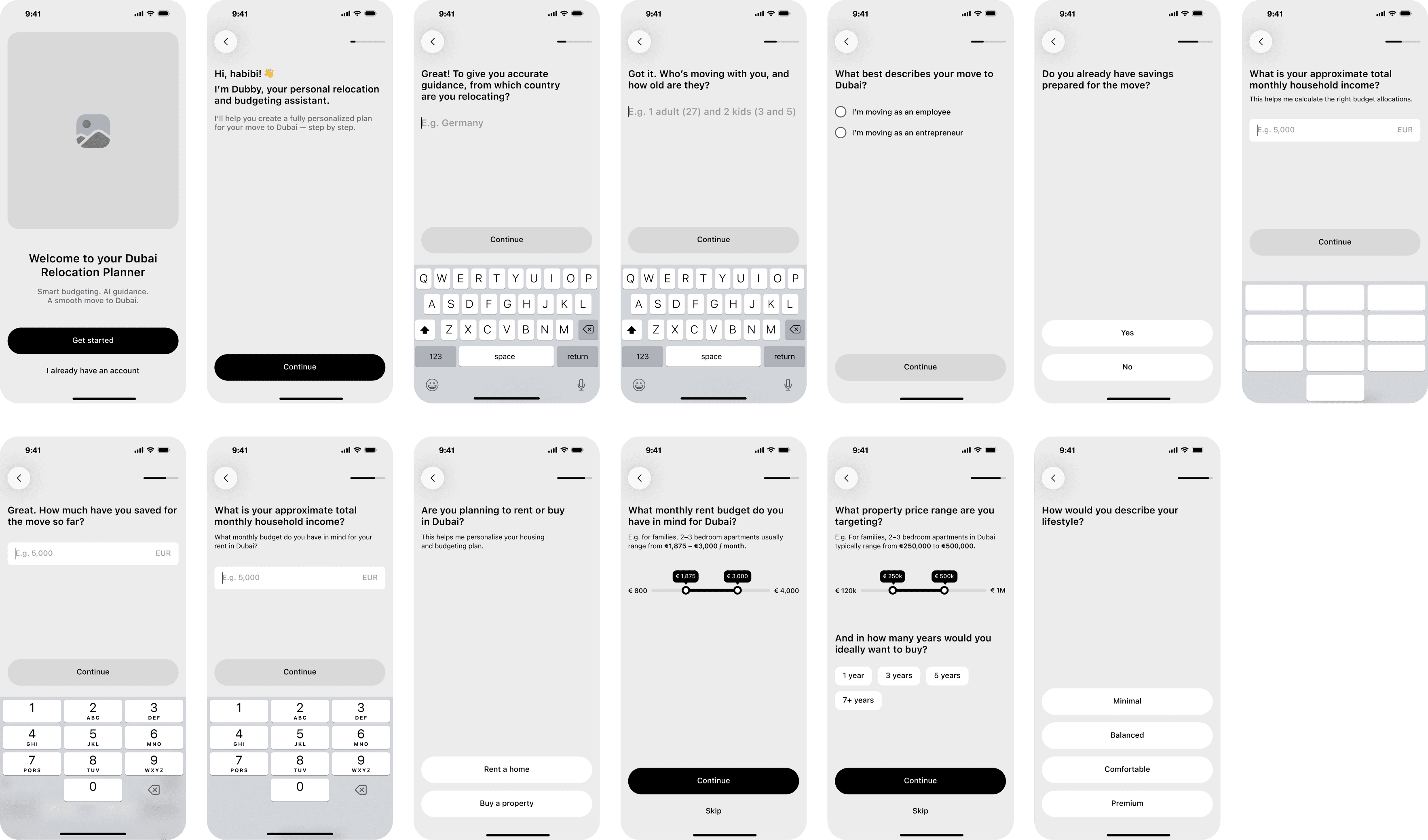 Initially, I designed a conventional step-based wizard consisting of multiple sequential screens where the user needed to input personal details, relocation intentions, budget, visa type, and family information.